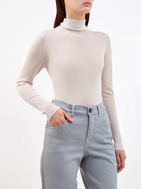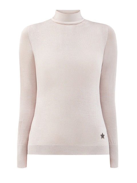 Водолазка облегающего кроя от Lorena Antoniazzi создана из благородного кашемира в кремовом оттенке. Особый вид прядения делает модель невесомой и гладкой, фактурная эластичная вязка завершает рукава и нижний край изделия. Символика бренда из мерцающих кристаллов Swarovski вносит сияющий штрих. Сделано в Италии.
