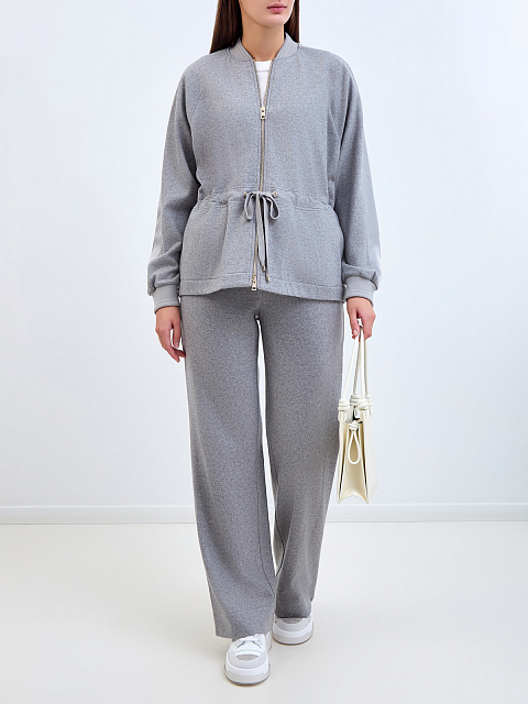Женская толстовка от Lorena Antoniazzi создана из меланжевой шерсти в серой гамме. Комфортная модель с трикотажным воротом и манжетами в стиле бомбера идеально подходит для путешествий и расслабленных повседневных аутфитов. Контраст фактур в образ вносят атласные лампасы, внутренняя кулиска позволяет регулировать силуэт по желанию. Детали: застежка на молнию, прорезные карманы, символика на спинке. Сделано в Италии.