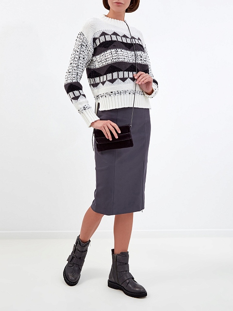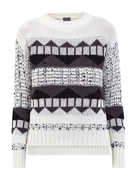 Вязаный шерстяной джемпер от Lorena Antoniazzi. Этнический мотив подчеркнут контрастной цветовой гаммой. Асимметричные нижние кромки с разрезами по бокам придают образу динамику, а эластичная отделка в рубчик обеспечивает посадку точно по фигуре. Детали: длинные рукава, круглый вырез горловины, символика бренда из перламутра на спинке. Сделано в Италии.