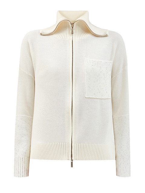 Элегантный кардиган от Lorena Antoniazzi выполнен из мягкой шерстяной пряжи. Благородный кремовый оттенок подчеркнут легким мерцанием вплетенных пайеток, свободный силуэт дополнен отложным воротом и отделкой кромок в английскую резинку. Детали: застежка на молнию, разрезы в боковых швах, накладной карман. Сделано в Италии.