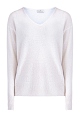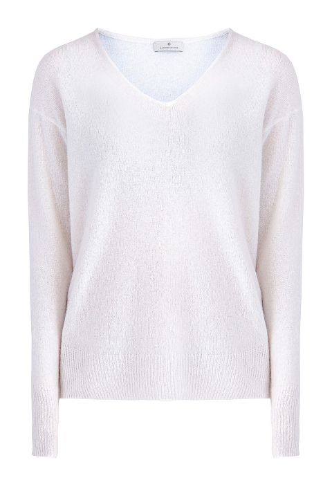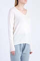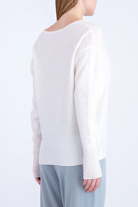 Лаконичный женский джемпер Maison Ullens свободного кроя, выполненный чулочной вязкой из кашемира и шелка белого цвета. Модель с глубоким V-образным вырезом и длинными рукавами со спущенной линией плеч. Кромки обрамлены эластичными резинками. Сделано во Франции.