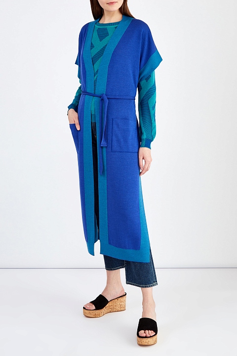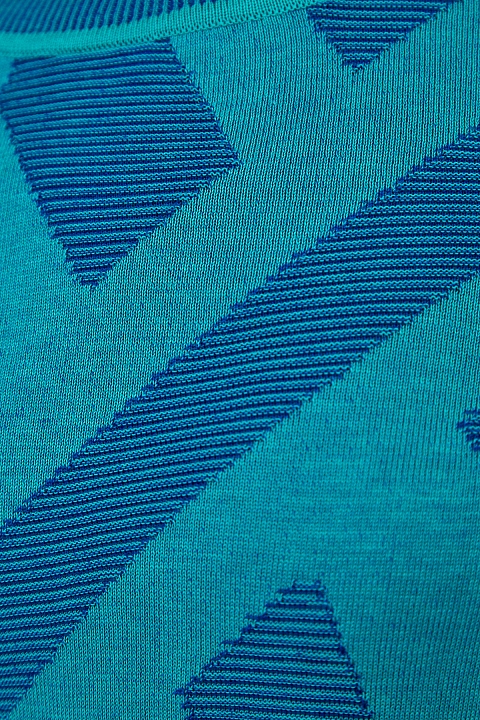 Джемпер свободного кроя от Maison Ullens выполнен из дышащей хлопковой пряжи. Волокна шелка в составе придают материалу струящийся эффект и легкий блеск по поверхности. Модель в глубоком бирюзовом оттенке декорирована геометрическим узором, вязка в рубчик создает контраст с гладкой фактурой фона. Эластичная окантовка кромок завершает образ в расслабленном стиле. Сделано в Италии.