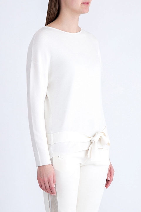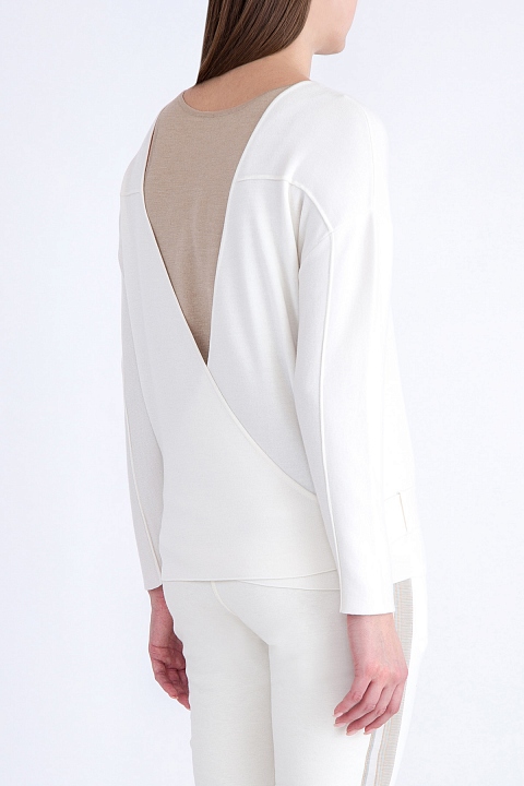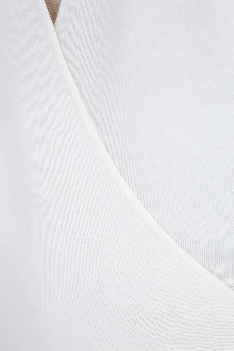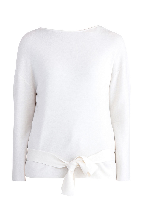 Функциональный женский джемпер на запах из весенне-летней коллекции Maison Ullens создан из тонкой и нежной кашемировой пряжи в белом оттенке. Особенностью модели стал универсальный крой — сторона с глубоким V-образным вырезом может стать как передней планкой, так и спинкой. Джемпер со спущенной линией плеч и длинными рукавами, завершенными необработанным краем, дополнен поясом. Сделано во Франции.