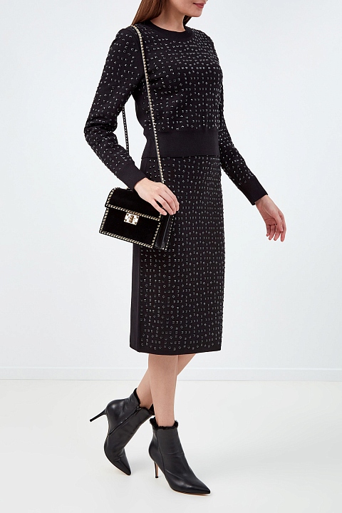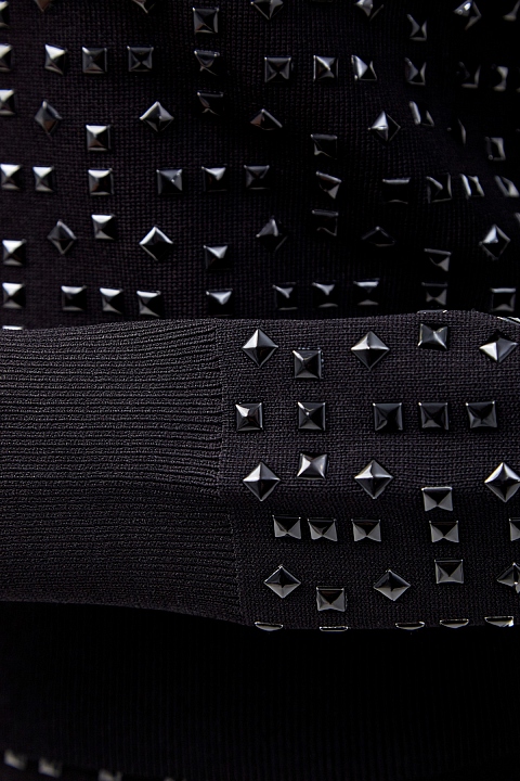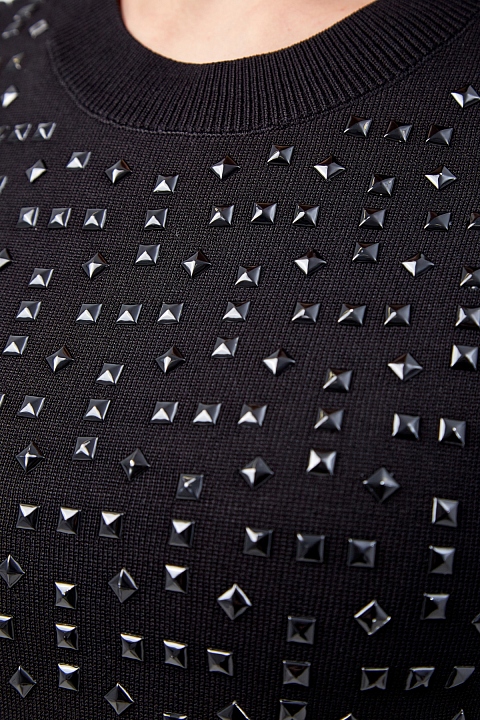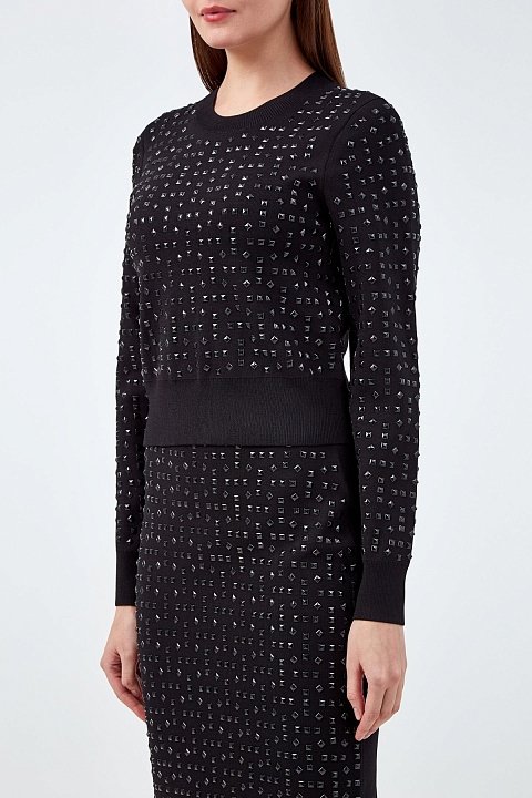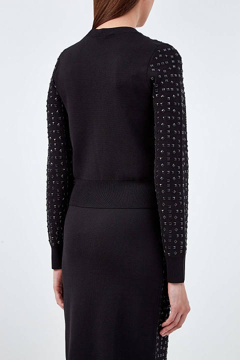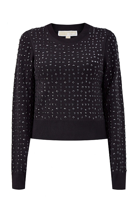 Укороченный джемпер из пряжи Stretch от MICHAEL Michael Kors садится строго по фигуре за счет плотной эластичной вязки. Модель в черном цвете дополнена глянцевой геометрической отделкой в тон на передней планке. Детали: эластичные манжеты и нижний край, круглая пройма горловины.