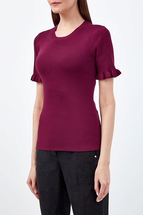 Стильный джемпер от MICHAEL Michael Kors выполнен из пряжи stretch, эластичные волокна в составе обеспечивают посадку точно по фигуре. Модель в оттенке фуксии органично дополнит повседневные образы. Элегантный штрих вносят оборки по рукавам. Детали: круглый вырез, гладкая пряжа с мягким сатиновым блеском.