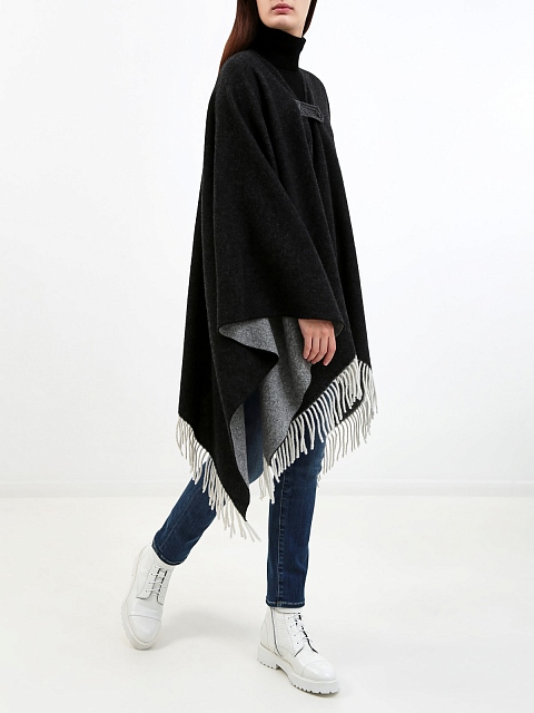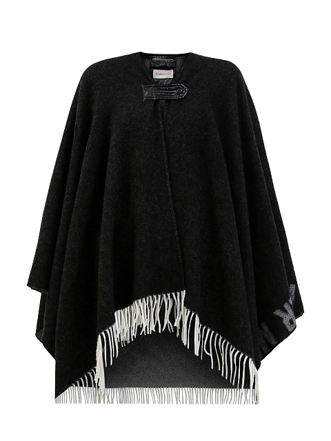 Стильная женская накидка от Moncler выполнена из мягкой шерстяной ткани, невысокий процент синтетических волокон в составе препятствует износу изделия. Модель с жаккардовым принтом и длинной бахромой по нижнему краю идеально подходит для завершения многослойных образов. Застежка на кнопку создана из блестящего нейлона laqué — культового символа Moncler.