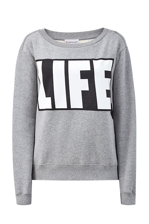 Базовый свитшот от Moncler выполнен из мягкого хлопкового футера с утепленной внутренней поверхностью. Аппликация на передней планке посвящена журналу Life как одному из символов истории Америки, фетровый логотип вносит в образ фирменный штрих. Овальная пройма горловины, манжеты на рукавах и нижняя кромка дополнены эластичной тесьмой для создания объемного силуэта в спортивном стиле. Спущенная линия плеч завершает дизайн.