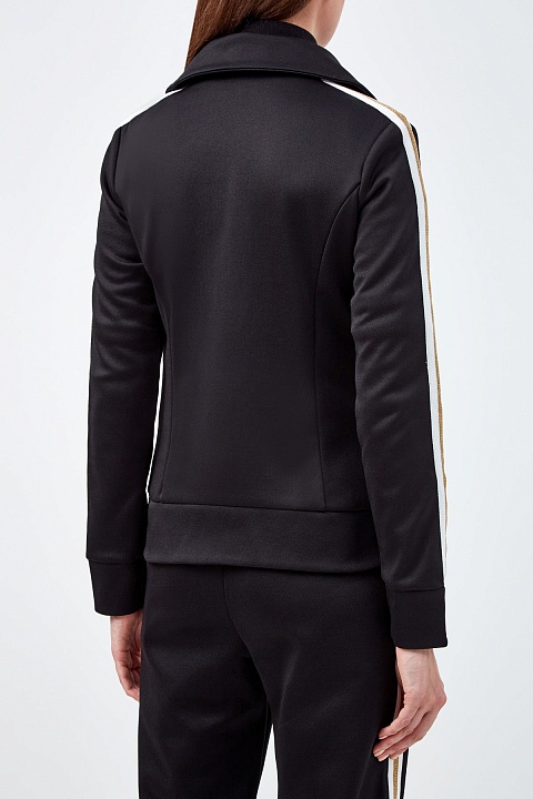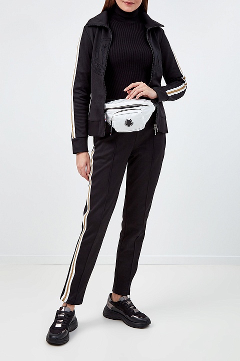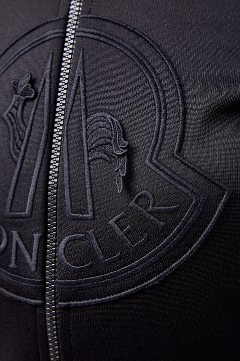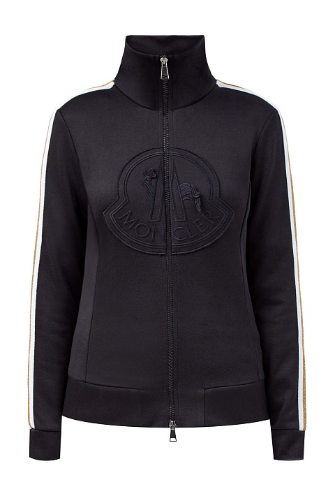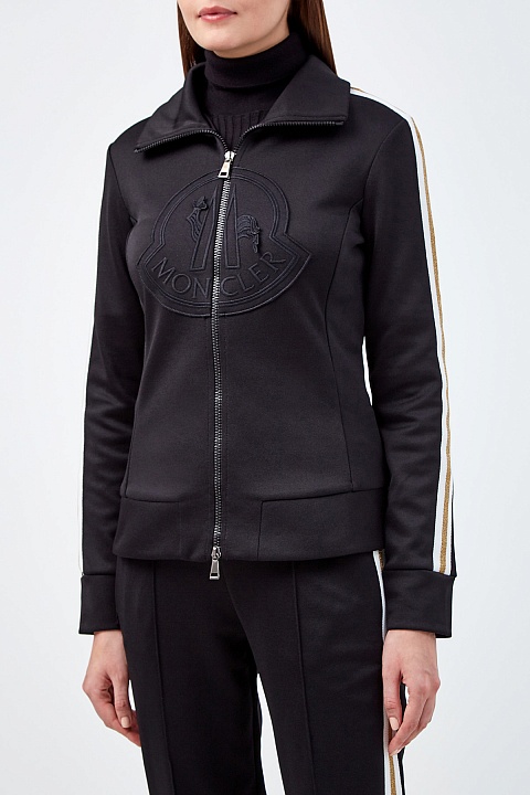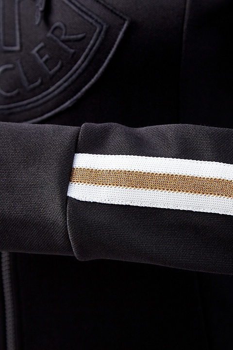 Укороченная толстовка от Moncler создана в стилистике эпохи 90-х. Плотная ткань с сатиновой фактурой и легким блеском дополнена вязаными лампасами с нитью золотистого люрекса. Однотонная модель декорирована вышитым макро-логотипом на передней планке. Детали: ворот-стойка, манжеты и нижняя кромка из эластичной ткани, застежка-молния.