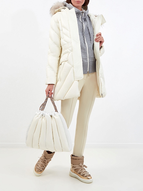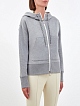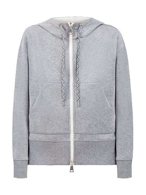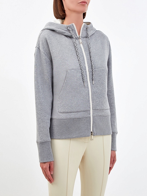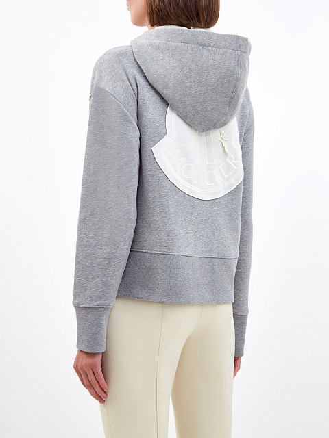 Универсальная женская толстовка в сером цвете от Moncler создана из плотного хлопкового футера. Модель характеризуется капюшоном на двухцветной кулиске с нейлоновой отделкой, накладными карманами и застежкой на молнию с двойным пуллером. Фирменный штрих — контрастный макро-логотип бренда на спинке изделия. Детали: длинные рукава, эластичные манжеты и нижний край.