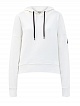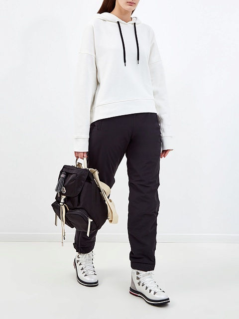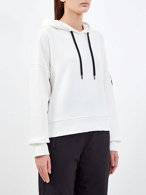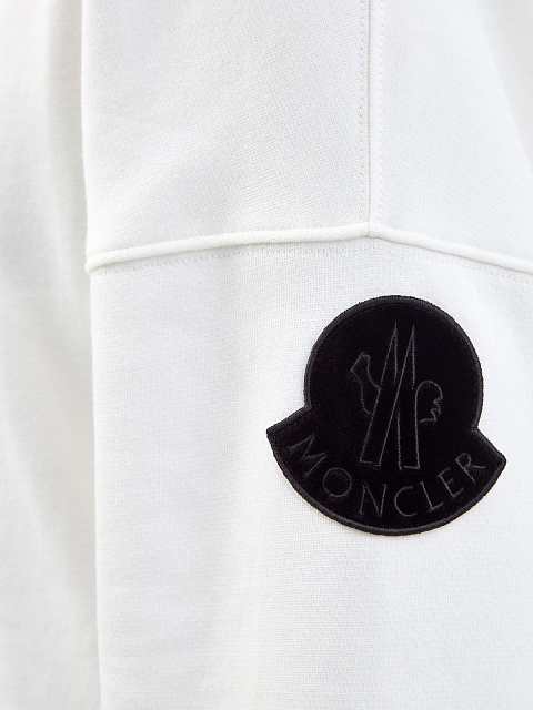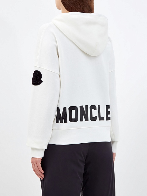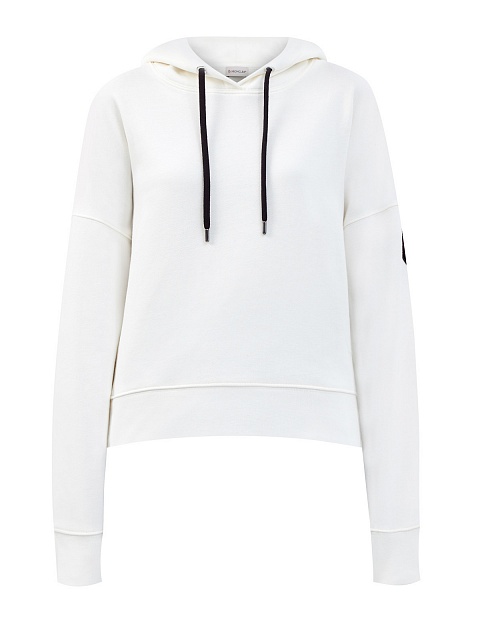 Укороченная толстовка от Moncler выполнена из плотного хлопкового футера. Фактурная внутренняя поверхность дополнительно утепляет изделие, невысокий процент синтетических волокон в составе препятствует образованию складок. Однотонная модель в белоснежном оттенке дополнена контрастным макро-принтом в стиле леттеринг на спинке. Детали: нашивка из фетра с логотипом, фактурные швы, капюшон на кулиске.