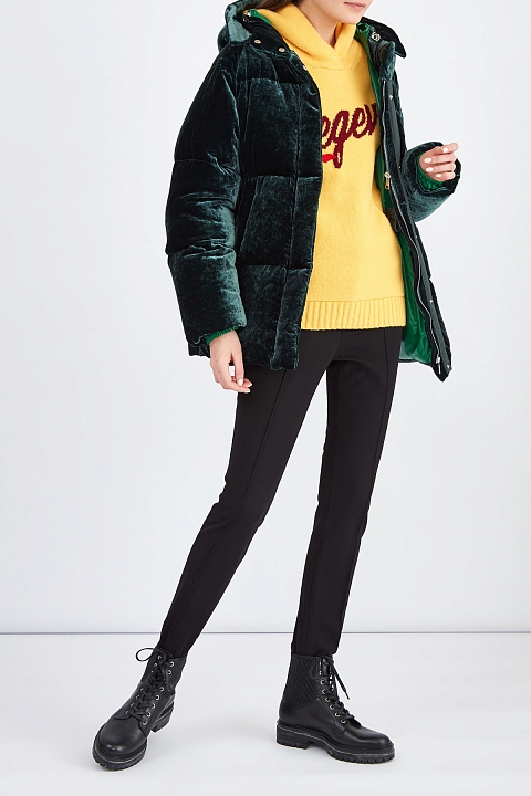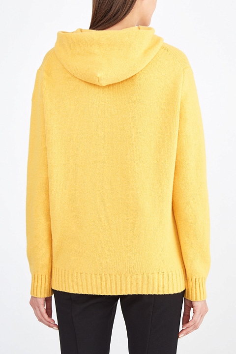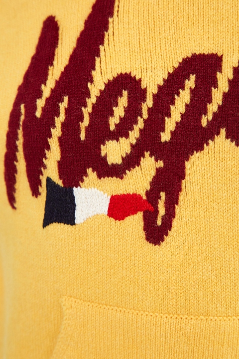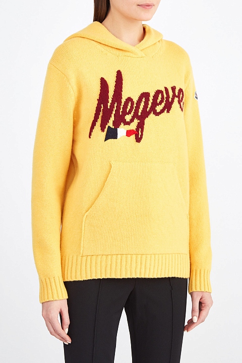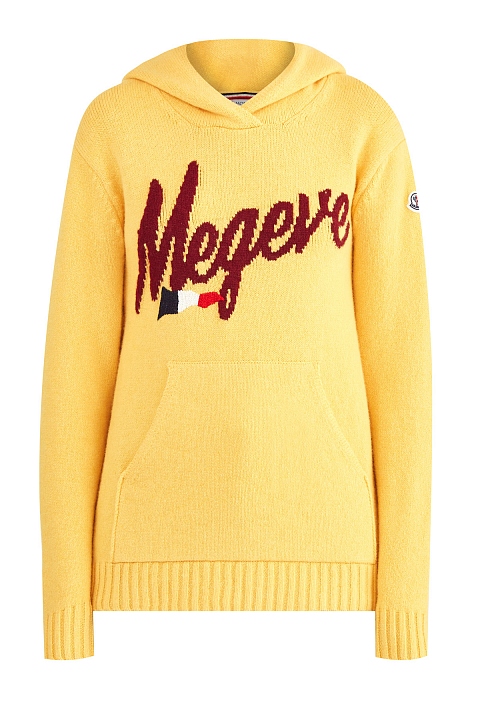 Яркая женская толстовка от Moncler выполнена из шерстяной и кашемировой пряжи с добавлением эластичных волокон в насыщенном канареечном оттенке. Передняя планка декорирована интарсией с названием горнолыжного альпийского курорта Межев с живописными горными дорогами и заснеженными вершинами. Детали: капюшон, эластичные кромки в английскую резинку, карман-кенгуру спереди.
