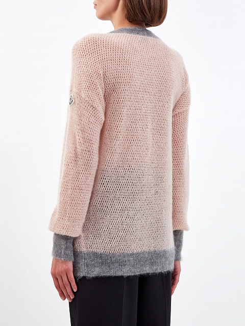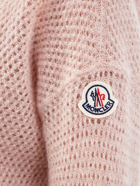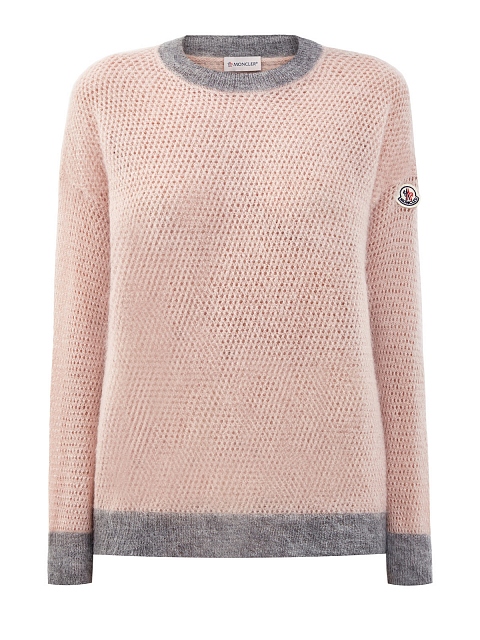 Женский джемпер ажурной вязки от Moncler создан из теплой пряжи на основе шерсти ангорской козы. Модель в пудрово-розовом оттенке дополнена контрастной эластичной отделкой кромок в сером цвете. Свободный крой и спущенная линия плеч придают повседневному образу расслабленный штрих. Детали: длинные рукава, круглый вырез горловины, логотип бренда из фетра.