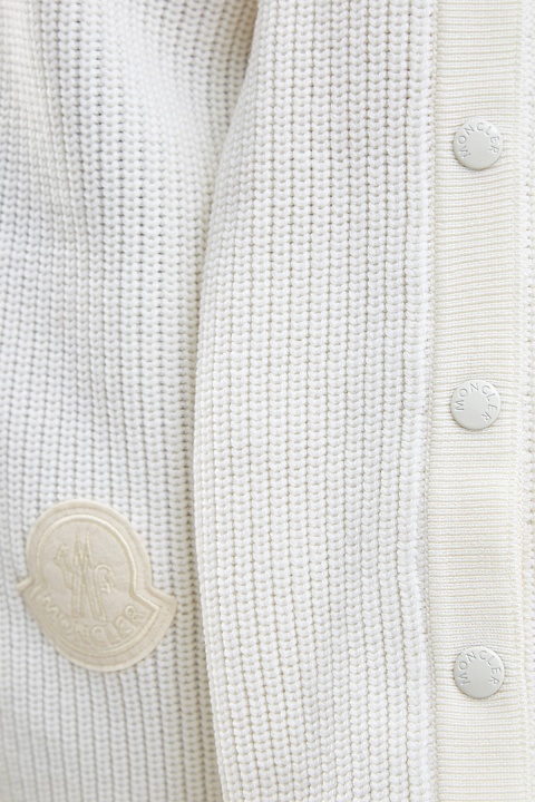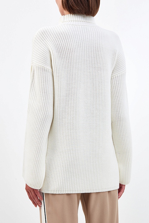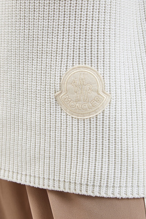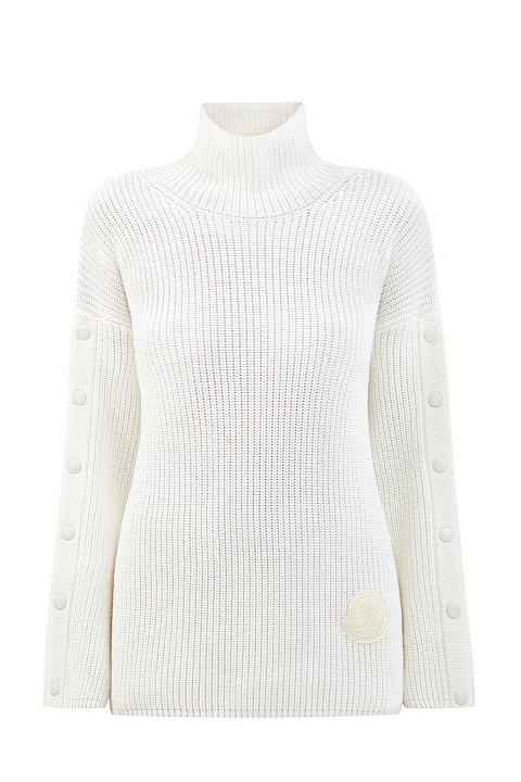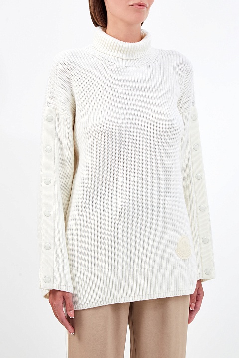 Теплый свитер свободного кроя от Moncler выполнен из натуральной шерстяной пряжи в оттенке слоновой кости. Спущенная линия плеч подчеркивает расслабленное настроение изделия, а расположенные на рукавах кнопки с эмалевым покрытием в тон придают дизайну графический акцент. Детали: высокий ворот для защиты от ветра, слегка удлиненный силуэт, фактурный логотип.
