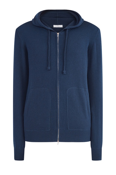 Уютная толстовка от Panicale выполнена из мягкой кашемировой пряжи в сложном серо-синем оттенке. Модель дополнена декоративными патчами на рукавах, двумя накладными карманами, а также капюшоном на кулиске. Широкая эластичная тесьма в рубчик на манжетах и нижней кромке обеспечивает комфортную посадку по фигуре и формирует объемный силуэт в спортивном стиле. Застежка-молния завершает дизайн. Сделано в Италии.