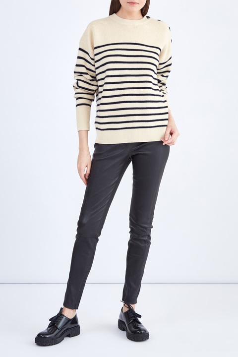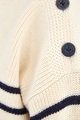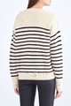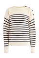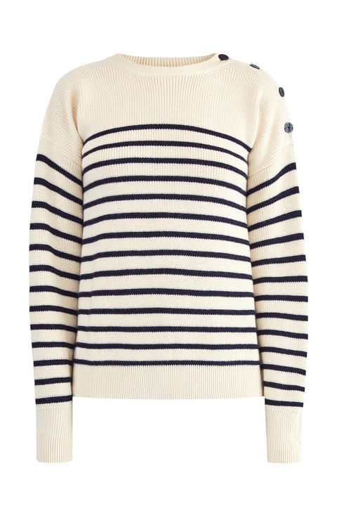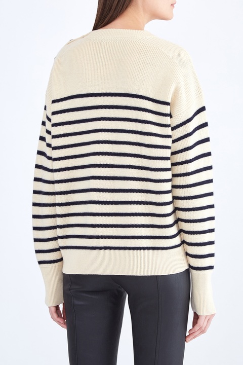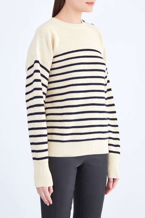 Стильный женский джемпер из коллекции Polo Ralph Lauren, выполнен из мягкой и теплой шерстяной пряжи в свободном крое. Модель создана, вдохновляясь морской тематикой, что прослеживается в полосатом узоре сине-бежевой гамме. Образ завершает асимметричная пуговичная застежка на линии плеча с тиснением в виде якорей и широкие резинки в рубчик на кромках.