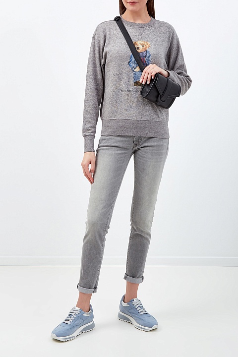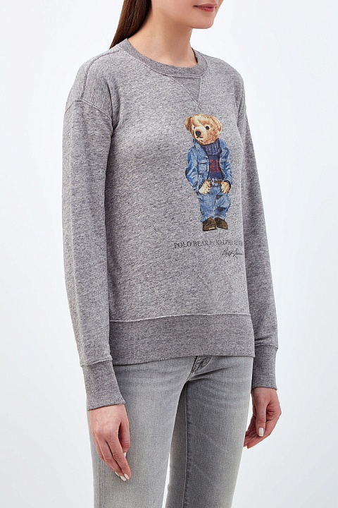 Хлопковый свитшот от Polo Ralph Lauren создан из плотного футера. Модель комфортного oversize-силуэта обеспечивает свободу движений. Особенностью изделия стала макро-аппликация с изображением медведя Поло — талисмана бренда. Расслабленный стиль подчеркивает спущенная линия плеч и эластичная отделка кромок.