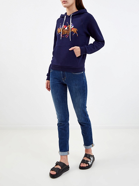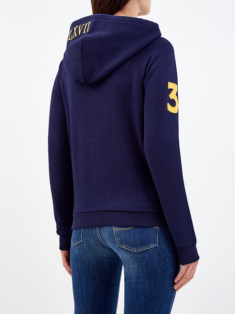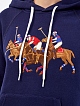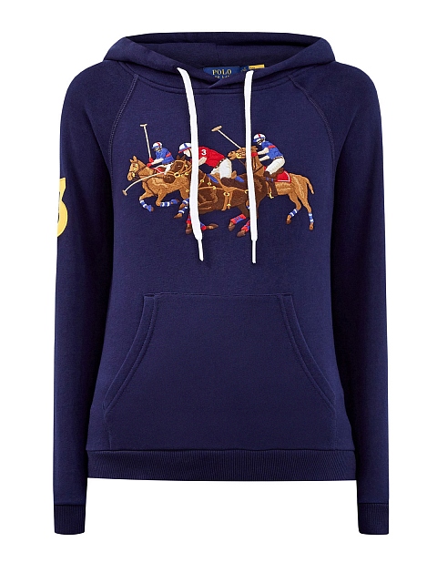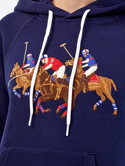 Худи из хлопкового футера от Polo Ralph Lauren на подкладке из мягкого флиса. Модель в насыщенном синем цвете украшена вышитым принтом с изображением матча, цифрой три — номером, который традиционно присвоен самому сильному игроку команды и винтажным упоминанием 1967 года, когда основатель бренда дебютировал со своей первой коллекцией галстуков. Детали: капюшон на кулиске, эластичные кромки, накладной карман.