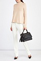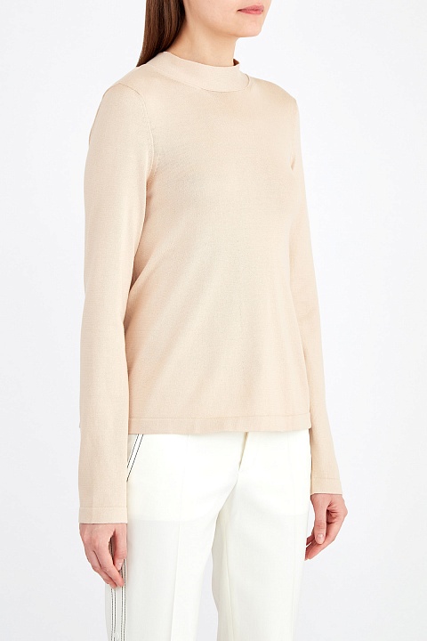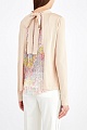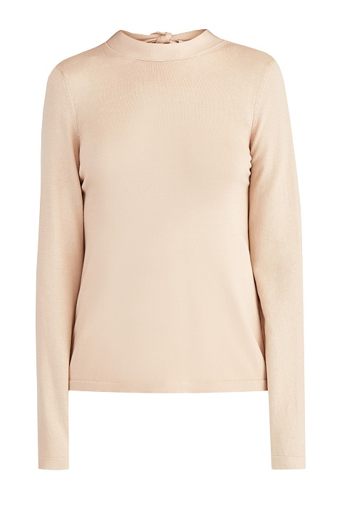 Базовый джемпер от REDValentino выполнен в технике плотной чулочной вязки из хлопковой пряжи в пудрово-бежевом оттенке. Романтическое настроение образу задает вставка на спинке из плиссированного шифона с принтом «Россыпь звезд». Ворот-стойка продолжен широкими лентами, которые образуют ниспадающий бант. Детали: длинные рукава, объемная отделка кромок.