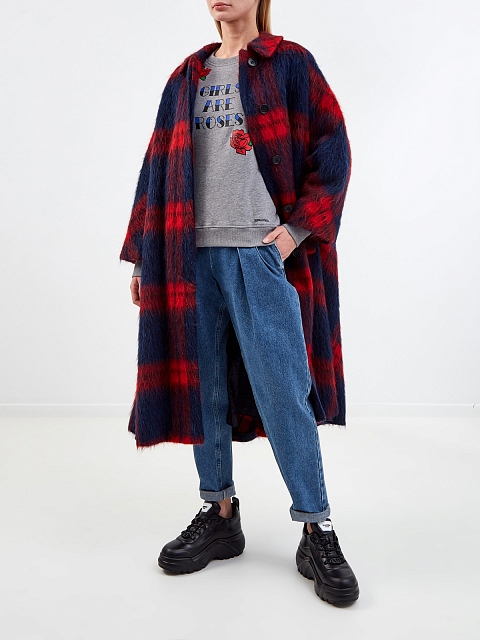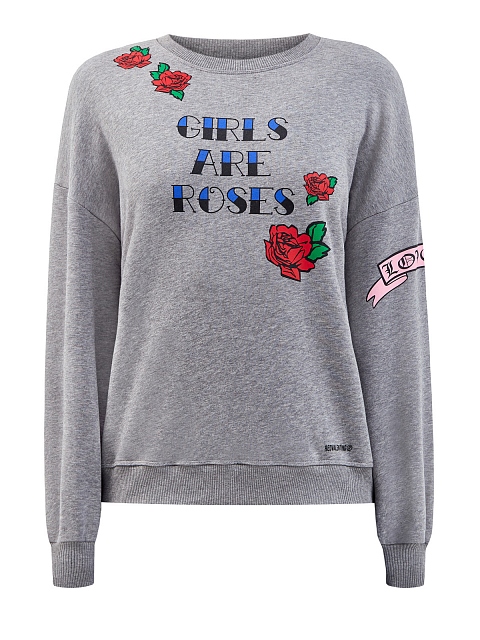 Женский свитшот свободного, слегка укороченного кроя от REDValentino создан из плотного хлопкового футера, фактурная внутренняя поверхность дополнительно утепляет изделие. Модель в меланжево-сером оттенке дополнена объемными рукавами со спущенной линией плеч. Фирменный штрих — принт Girls Are Roses на передней планке. Детали: круглый вырез горловины, эластичная отделка кромок.