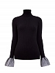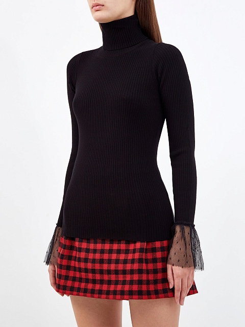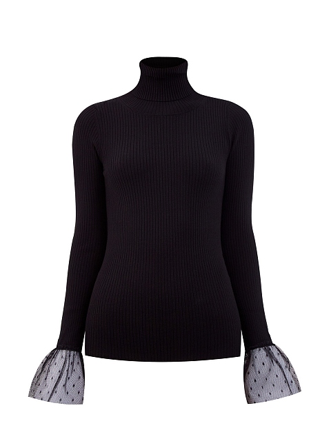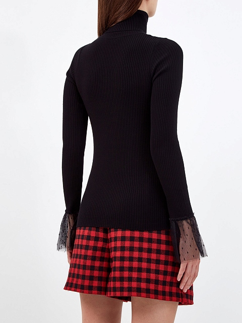 Элегантная женская водолазка от REDValentino выполнена из вискозы stretch в черном цвете. Эластичный материал на основе древесных волокон делает повседневные образы максимально комфортными. Техника вязки в фактурный рубчик обеспечивает точную посадку по фигуре, а высокий воротник защищает от ветра. Фирменный штрих — объемные вставки из тюля «пуэн-деспри» на манжетах изделия.