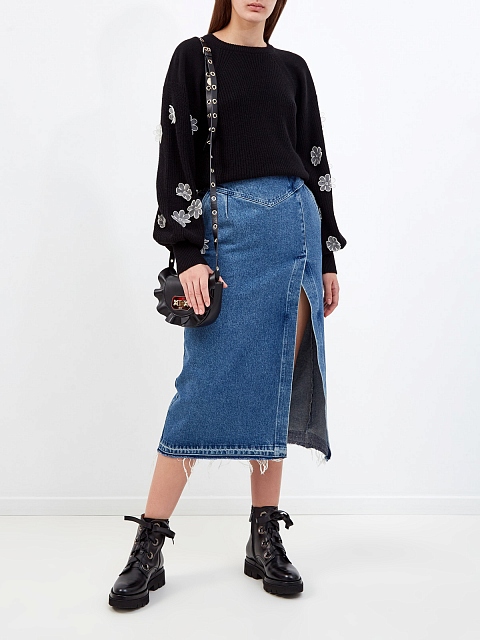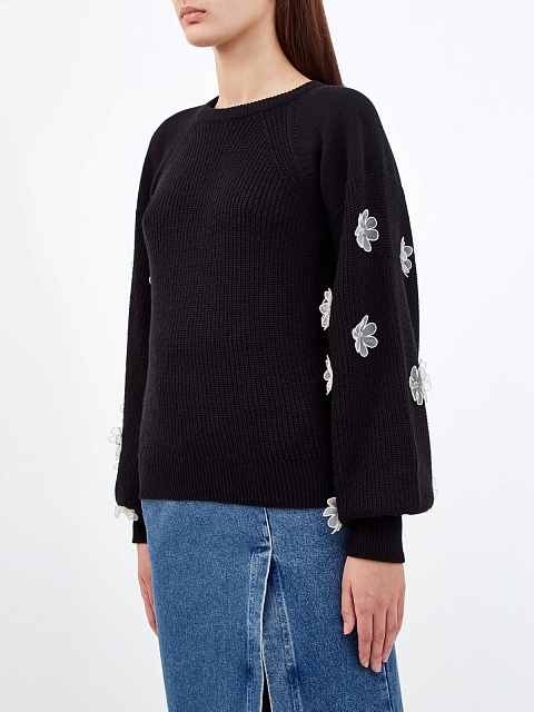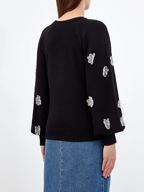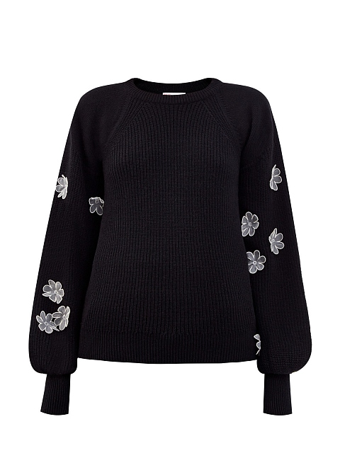 Оригинальный черный джемпер от REDValentino создан из теплой пряжи на основе шерсти и кашемира. Невысокий процент синтетических волокон в составе обеспечивает максимальный комфорт в движении и препятствует износу. Архитектурные рукава-буфы с контрастными по фактуре плечевыми планками дополнены объемной цветочной вышивкой из органзы. Детали: круглый вырез горловины, эластичная отделка кромок.