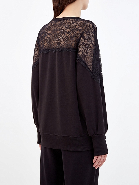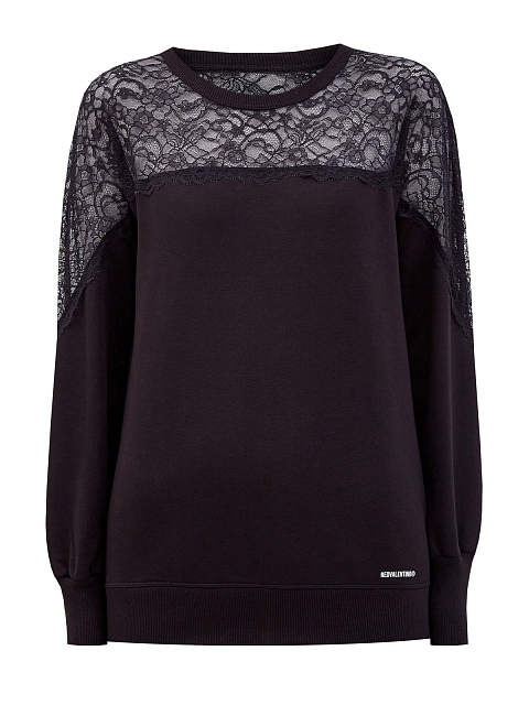 Элегантный женский свитшот от REDValentino выполнен из хлопкового футера в черном цвете. Гладкий материал обеспечивает максимальный комфорт в движении, расслабленный силуэт со спущенной линией плеч обеспечивает посадку по фигуре. Вставка из тонкого кружева ручной работы завершает дизайн. Детали: круглый вырез горловины, эластичная отделка кромок в рубчик, контрастный логотип бренда.
