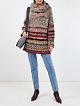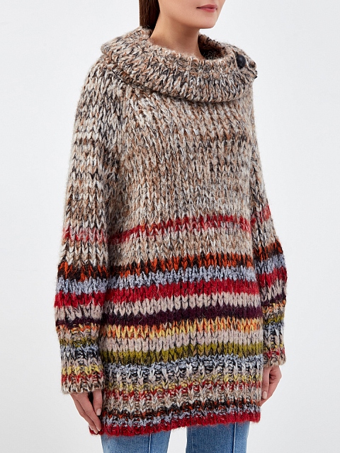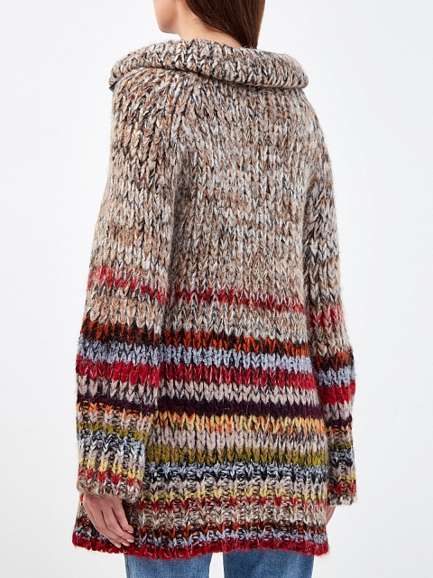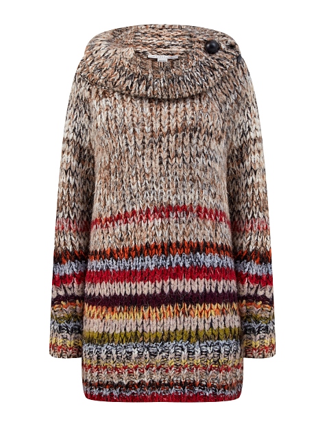 Удлиненный свитер от Stella McCartney. Для создания модели была выбрана объемная пряжа из шерсти альпака, синтетические волокна в составе облегчают уход за изделием. Меланжевый узор дополнен принтом в яркую полоску. Эластичная отделка в рубчик по кромкам подчеркивает объемный силуэт. Детали: широкий вырез с отворотом и макро-пуговицами, рукава-реглан.