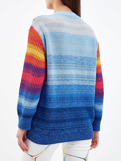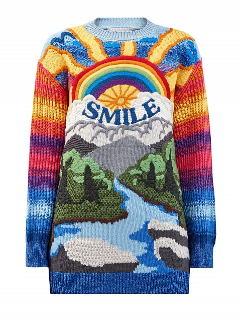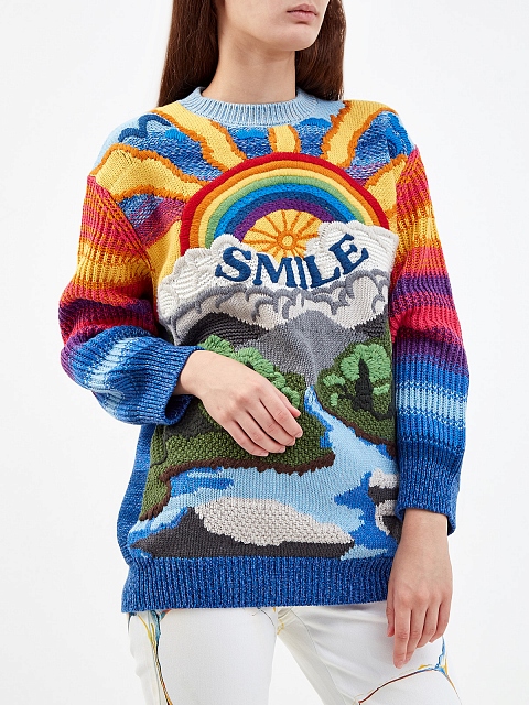 Пуловер от Stella McCartney вошел в линию J is for Joy A to Z Manifesto — коллекцию, объединяющую моду, искусство и экологичность. Вязаный принт-интарсия разработан мультимедийным художником Хоу Цзычао и воплощает столкновение природы и человечества, дистанцию между искусственным и естественным. Состав на основе шерстяной пряжи и хлопка обеспечивает максимальный комфорт. Детали: круглый вырез, длинные рукава, свободный силуэт.