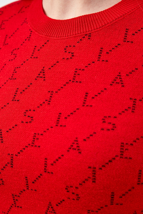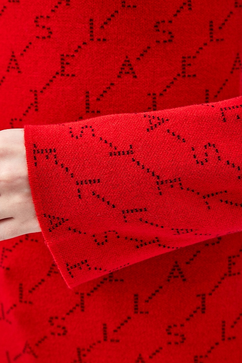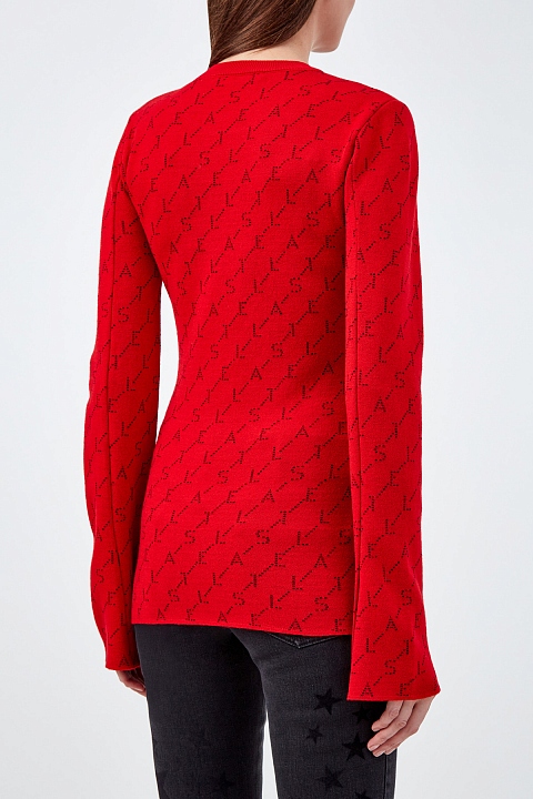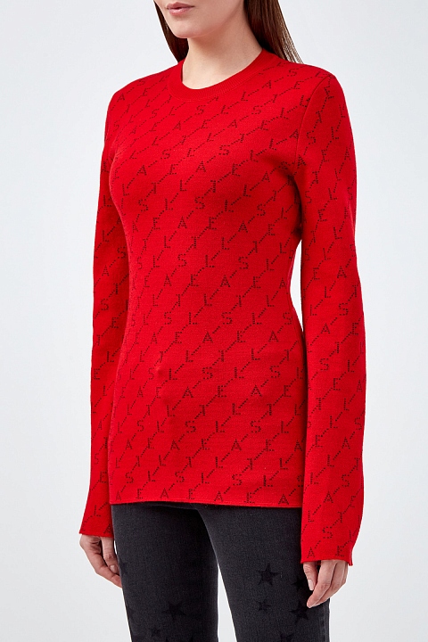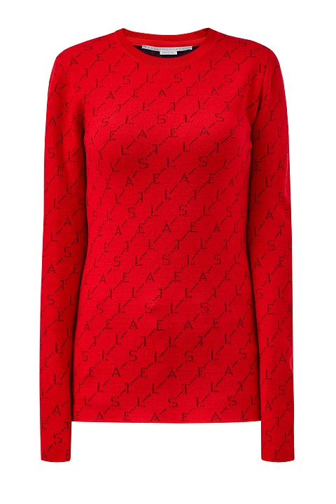 Лаконичный джемпер от Stella McCartney выполнен в алом оттенке из плотной шерстяной пряжи. Техника двойного плетения образует жаккардовый all-over принт в виде монограммы. Мягкий материал устойчив к низким температурам благодаря свойствам натуральных волокон. Стильным акцентом стали слегка расклешенные рукава. Детали: круглая пройма горловины, эластичная вязка.