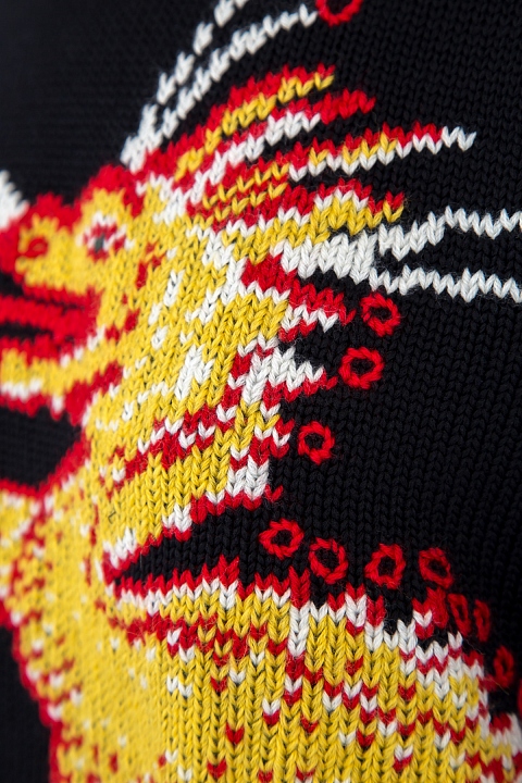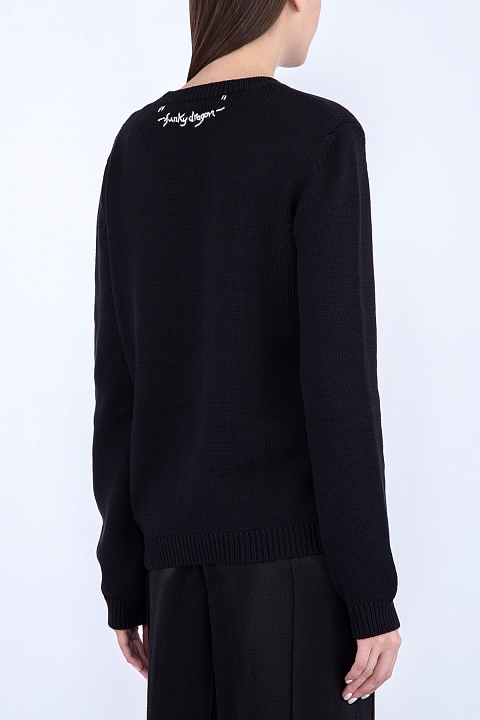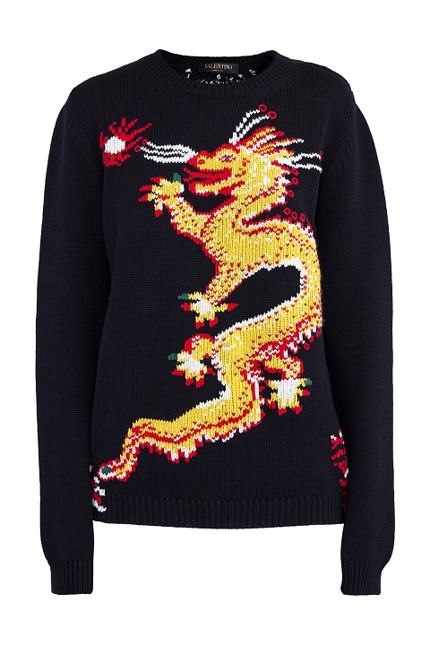 Эффектный женский джемпер Valentino, выполненный из натурального трикотажного хлопка плотной чулочной вязкой. Модель с круглым вырезом горловины и длинными втачными рукавами. Особенностью этой модели является интарзийный узор "Дракон", отсылающий к восточной тематике коллекции. Произведено в Италии.