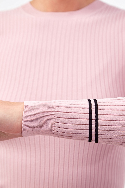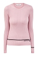 Эффектный женский пуловер в пастельном розовом оттенке от Valentino выполнен из эластичной фактурной пряжи в широкий рубчик. Модель декорирована интарсийным узором в виде параллельных полосок, выполненным контрастной черной нитью. Монограмма бренда на спинке и передней планке завершает дизайн. Детали: круглый вырез горловины, однотонные эластичные кромки в технике английской вязки, облегающий силуэт. Сделано в Италии.