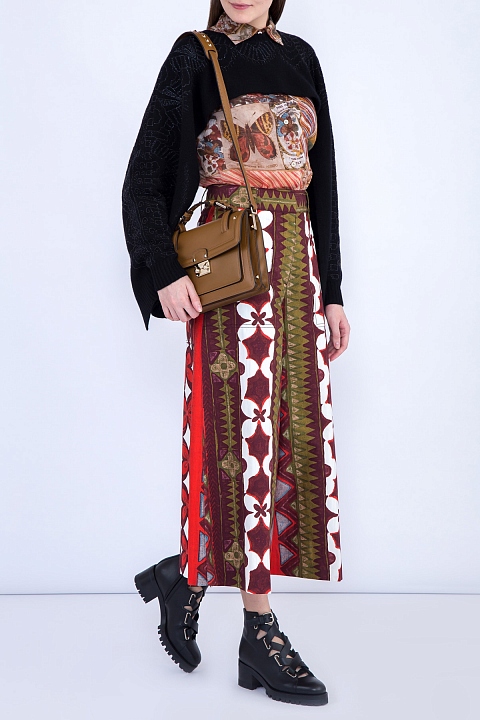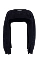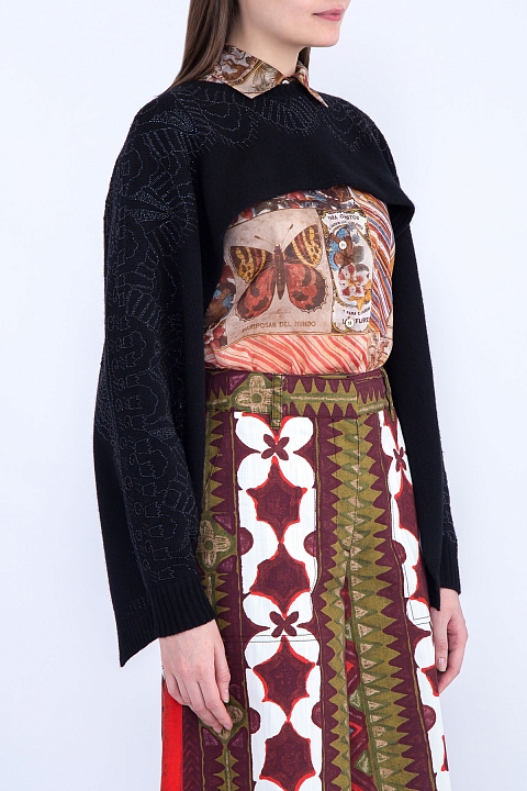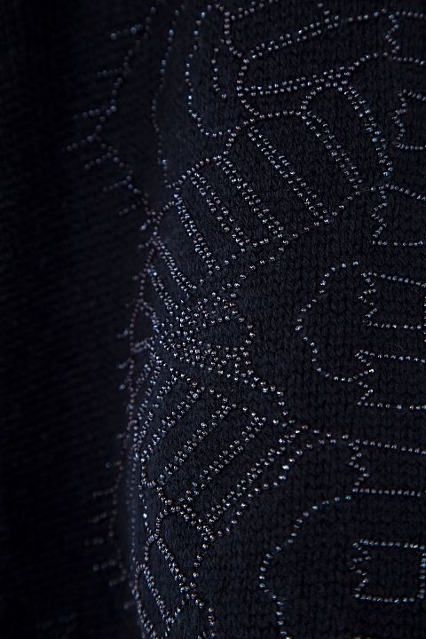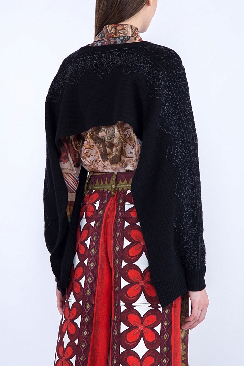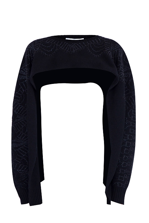 Эффектное трикотажное болеро Valentino, выполненное из мягкого кашемира и украшенное повторяющимся мерцающим узором по всей поверхности. Модель характеризуется длинными свободными рукавами и круглым вырезом горловины с эластичной каймой. Сделано в Италии.