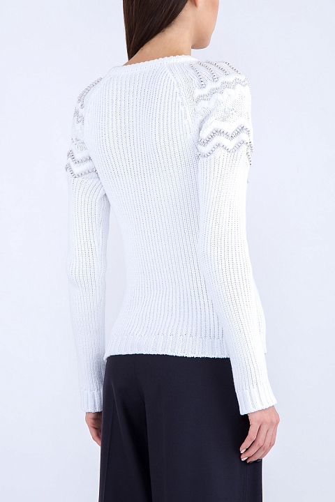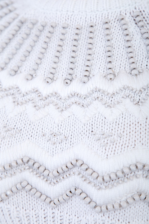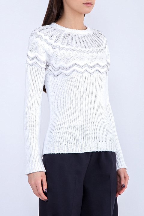 Лаконичный женский джемпер Valentino приталенного кроя, выполненный из трикотажного хлопка кристально-белого цвета, украшенного норвежским орнаментом с бусинами и бисером в тон. Модель с длинными рукавами-реглан и круглым вырезом под горло в рубчик. Сделано в Италии.