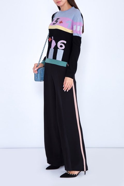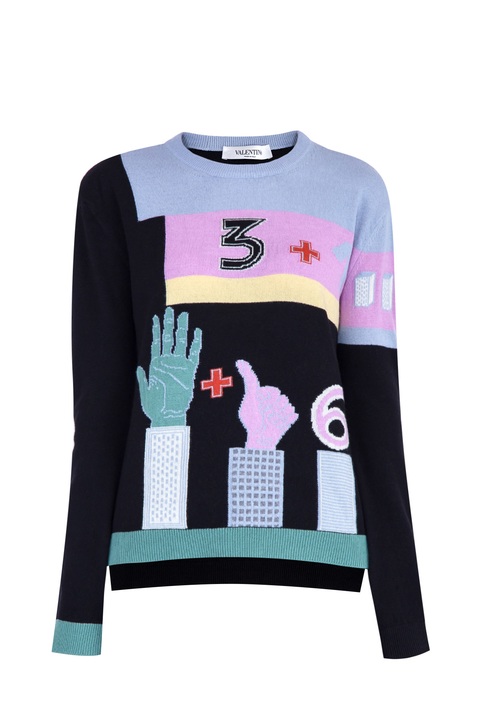 Джемпер приталенного кроя из коллекции Valentino, выполненный из шерсти и кашемира с мягкой матовой поверхностью, украшенной узором Counting Six, созданным по мотивам творчества миланской дизайн-группы «Мемфис». Модель с круглым воротом и длинными рукавами со спущенным окатом плеча. Сделано в Италии.