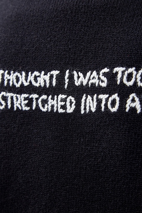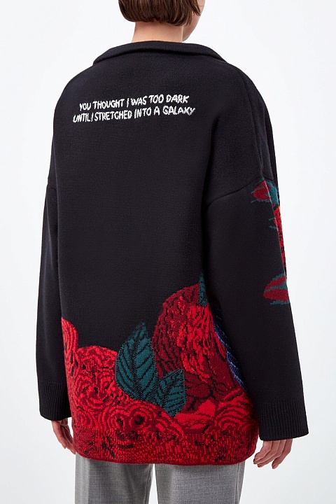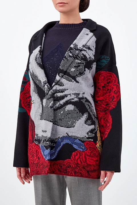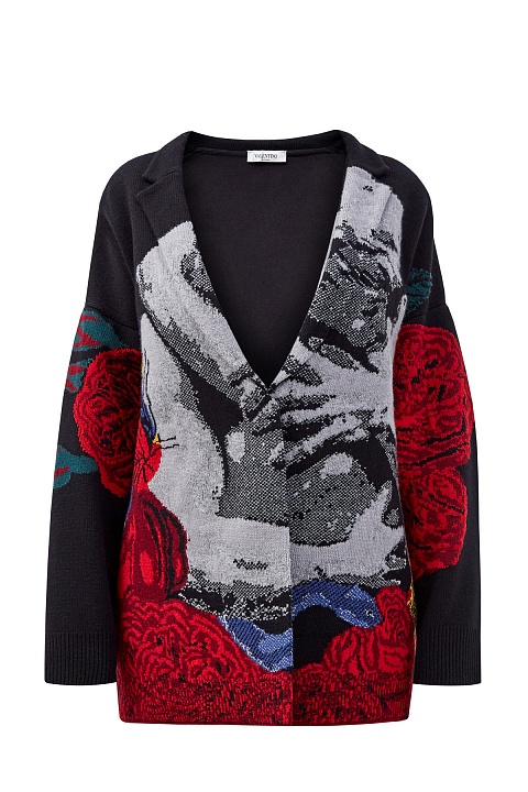 Кардиган из шерсти и кашемира от Valentino из коллаборации с брендом Undercover. Принт от Jun Takahashi в романтическом стиле объединяет ключевые элементы — паттерны Graphic Lovers и Chain Rose, а вышитые вручную детали придают рисунку объем. Характерный для всей коллекции стритстайл подчеркнут oversize-силуэтом со спущенной линией плеч. Внутренняя хлопковая основа структурирует силуэт. Сделано в Италии.