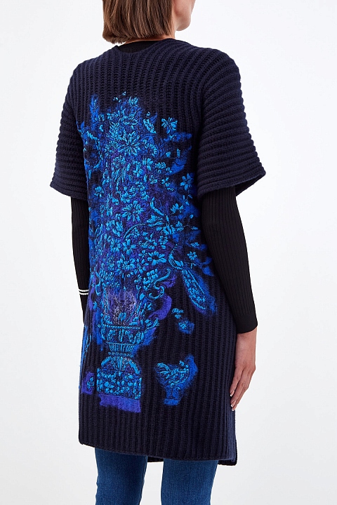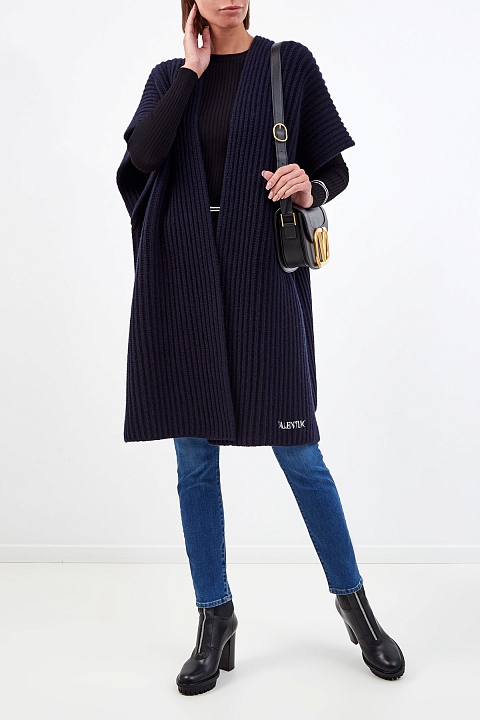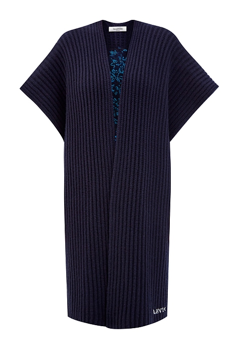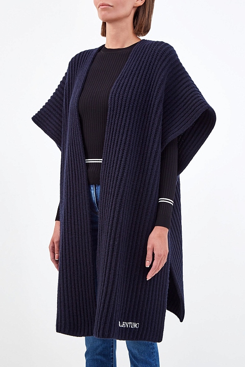 Элегантная накидка-пончо от Valentino создана из теплой пряжи на основе шерсти и кашемира. Ценные свойства натуральных волокон делают модель идеальным дополнением повседневных образов в холодное время года. Изделие фактурной вязки в оттенке ночного неба украшено вышивкой Bluegrace, вдохновленной росписью на делфтском фарфоре. Детали: контрастный логотип с монограммой бренда, короткие рукава, без застежки. Сделано в Италии.