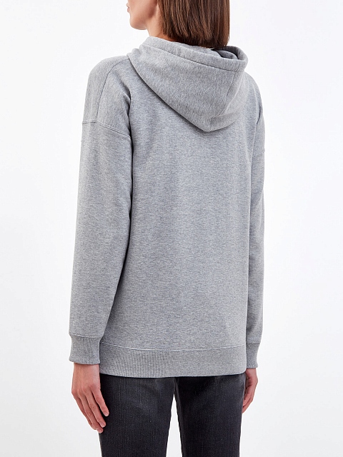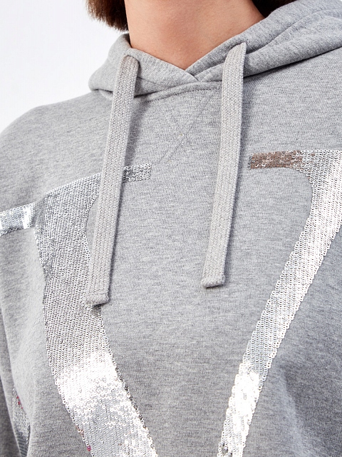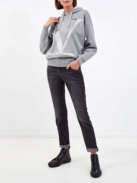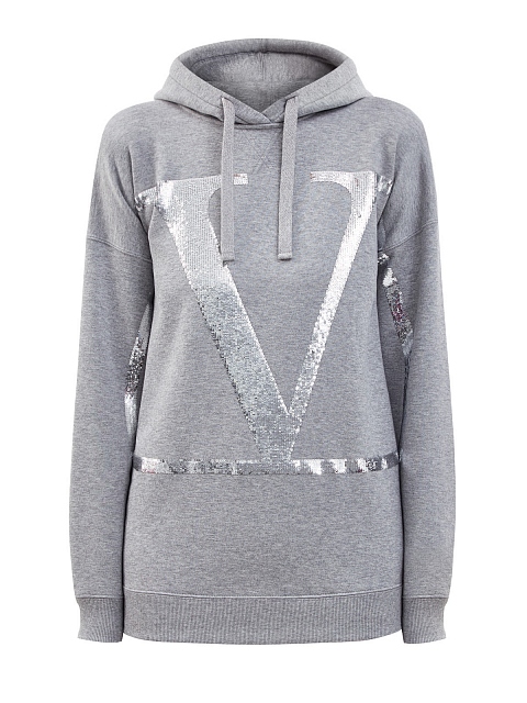 Толстовка в меланжево-сером оттенке от Valentino создана из гладкого хлопкового джерси. Невысокий процент синтетических волокон в составе облегчает уход за изделием, эластичная отделка манжет и нижнего края не позволяет холодному воздуху проникать внутрь. Фирменный стиль подчеркивает макро-вышивка из пайеток VLogo Signature. Детали: капюшон на кулиске, спущенная линия плеч. Сделано в Италии.