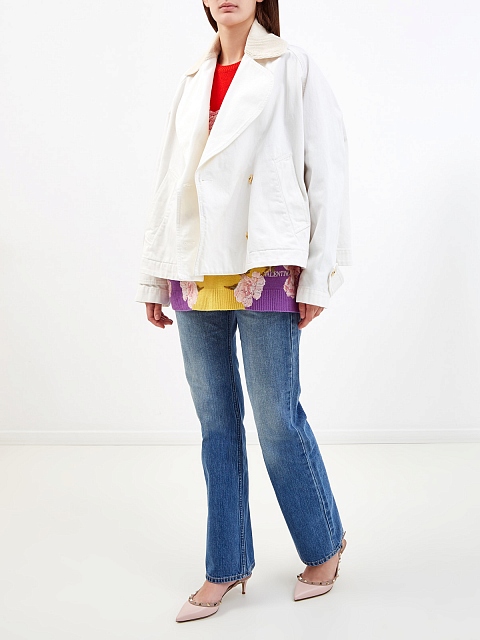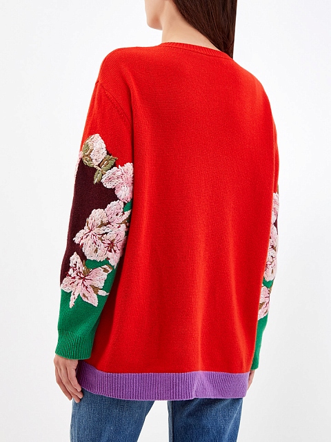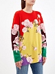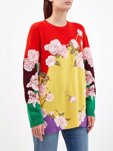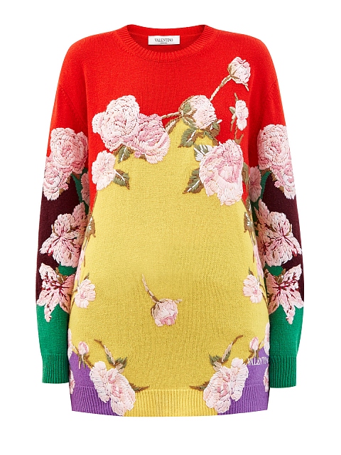 Удлиненный пуловер-oversize от Valentino. Для создания изделия была выбрана мягкая пряжа из шерсти и кашемира. Принт Flying Flowers вышит мастерами бренда вручную и делает каждое изделие уникальным. Свободный силуэт со спущенной линией плеч и colorblock-окантовка придает всему образу расслабленное настроение. Детали: эластичная отделка английской вязки по краям, круглый вырез. Сделано в Италии.