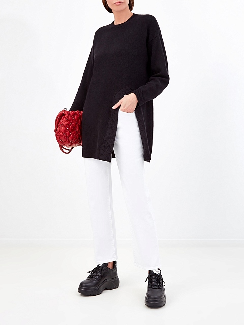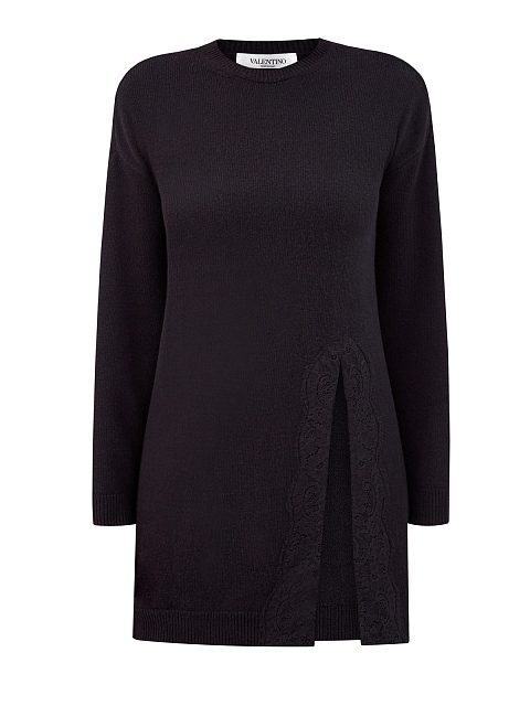 Удлиненный джемпер от Valentino представлен в черном цвете. Для создания модели была выбрана пряжа из шерсти и кашемира — полностью натуральный состав обеспечивает максимальный комфорт. Расслабленный крой со спущенной линией плеч дополнен высоким разрезом, который придает образу динамику, а кружевная отделка подчеркивает фирменную элегантность. Детали: круглый вырез горловины, эластичная отделка манжет и нижнего края. Сделано в Италии.