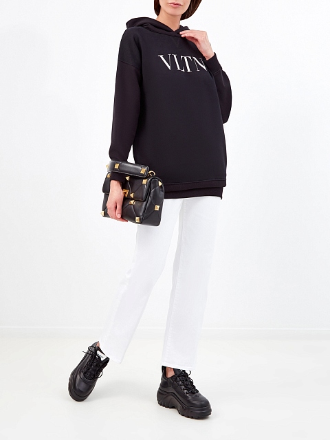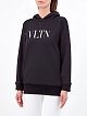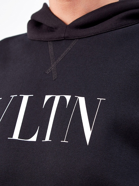 Удлиненное худи от Valentino. Модель представлена в базовом черном цвете и выполнена из плотного хлопка — эластичная, дышащая и гигроскопичная ткань обеспечивает максимальный комфорт. Удлиненная эластичная отделка нижнего края позволяет по желанию трансформировать силуэт. Детали: объемные швы, глубокий капюшон, аппликация VLTN контрастного оттенка. Сделано в Италии.