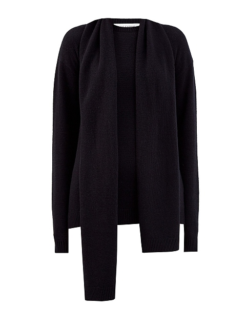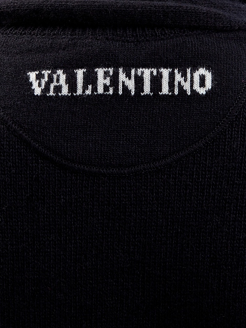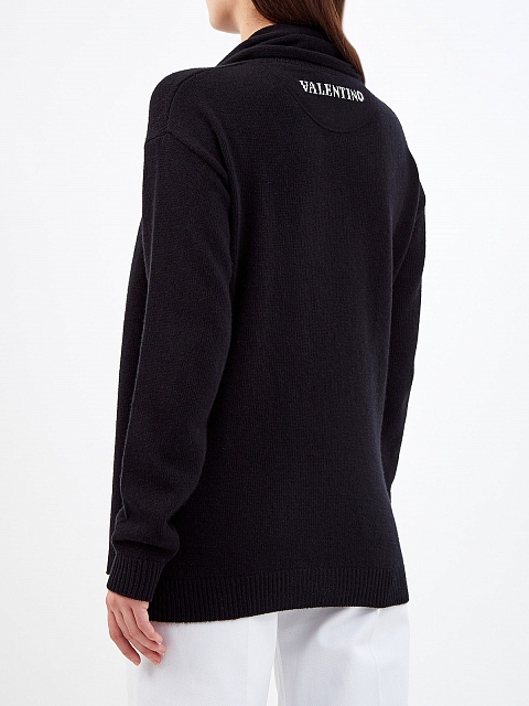 Джемпер от Valentino создан в черном цвете из теплой шерстяной пряжи, ценные волокна кашемира придают материалу благородный блеск. Круглый вырез горловины продолжен широким асимметричным шарфом в тон. Детали: спущенная линия плеч, эластичная отделка манжет и нижнего края, контрастный логотип на спинке. Сделано в Италии.