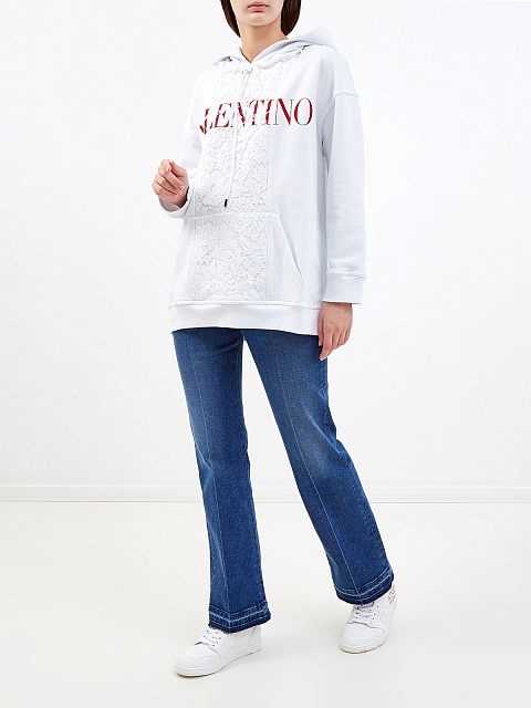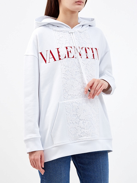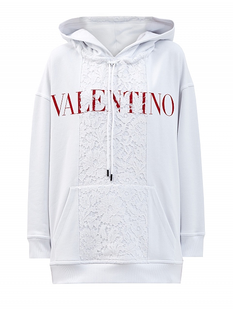 Удлиненное белое худи от Valentino выполнено из плотного хлопка джерси — мягкая и гигроскопичная ткань обеспечивает максимальный комфорт в движении. Вставка из кружева Heavy Lace и яркий макро-принт придают изделию расслабленный акцент. Детали: глубокий капюшон на регулируемой кулиске, накладной карман, эластичная отделка кромок. Сделано в Италии.