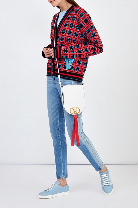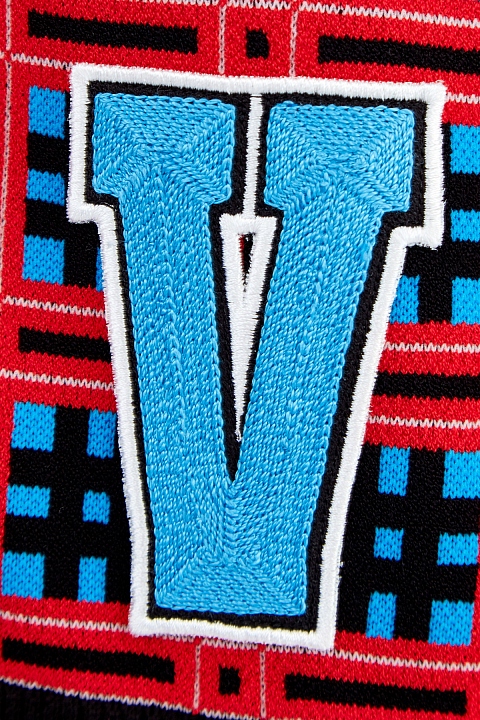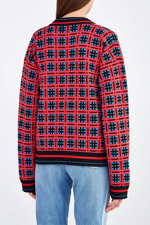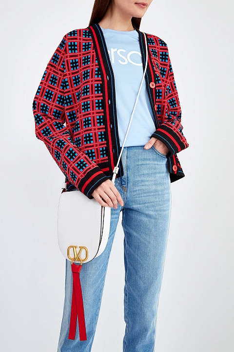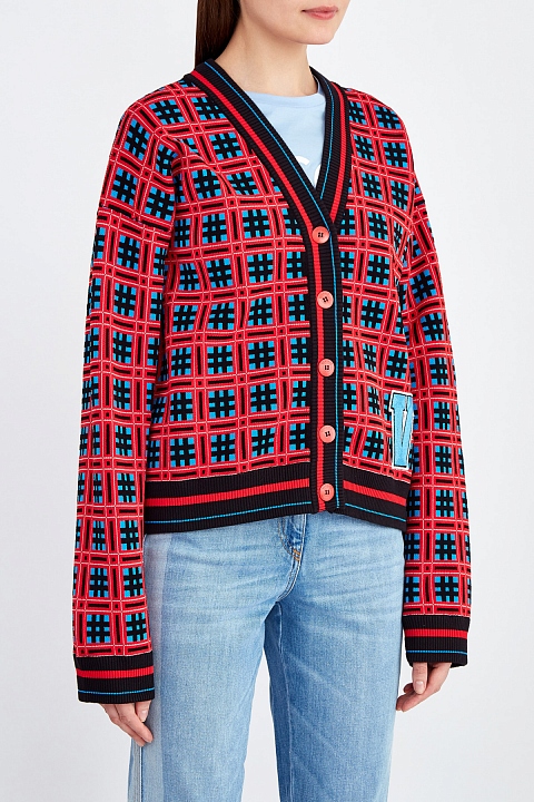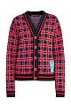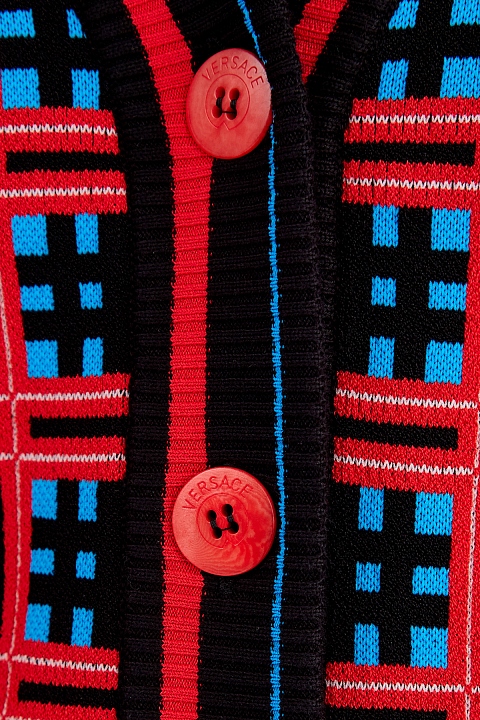 Яркий кардиган от Versace выполнен из плотного хлопкового жаккарда с фирменным мотивом «Fire Checked Tapestry». Кромки с фактурной отделкой в рубчик дополнены узором в полоску и повторяют цветовую гамму паттерна. Передняя планка декорирована патчем в виде вышитой символики «V». Детали: шалевый воротник, застежка на брендированные пуговицы. Сделано в Италии.