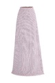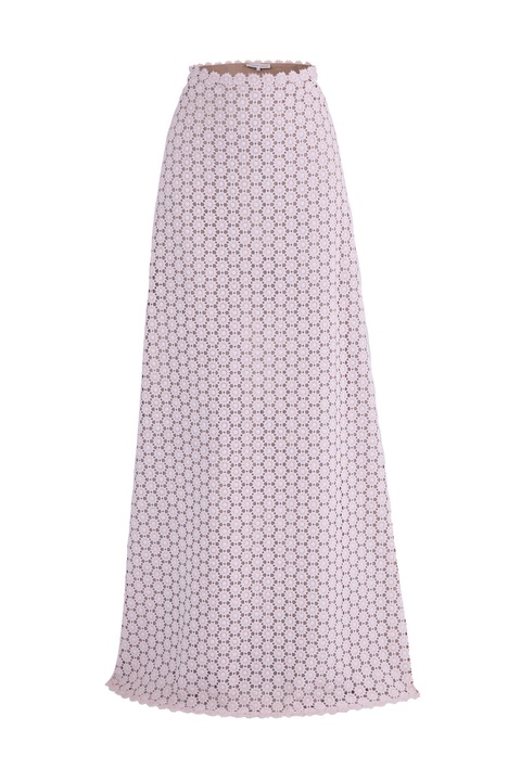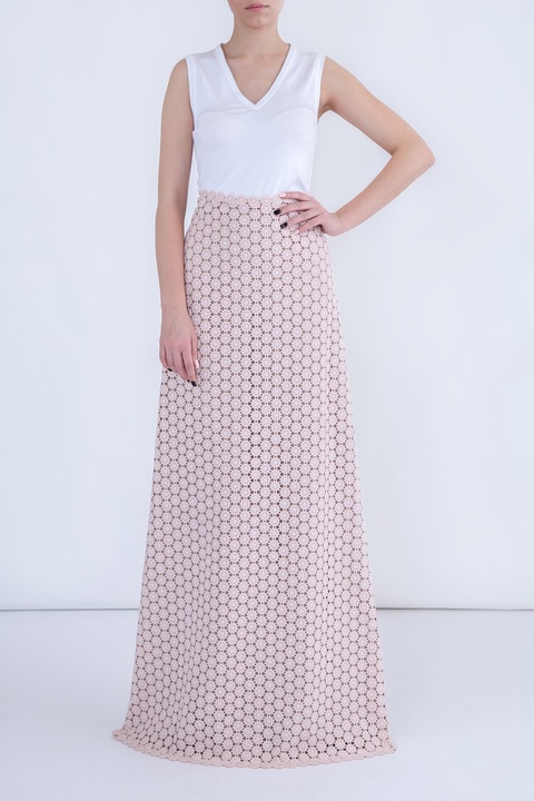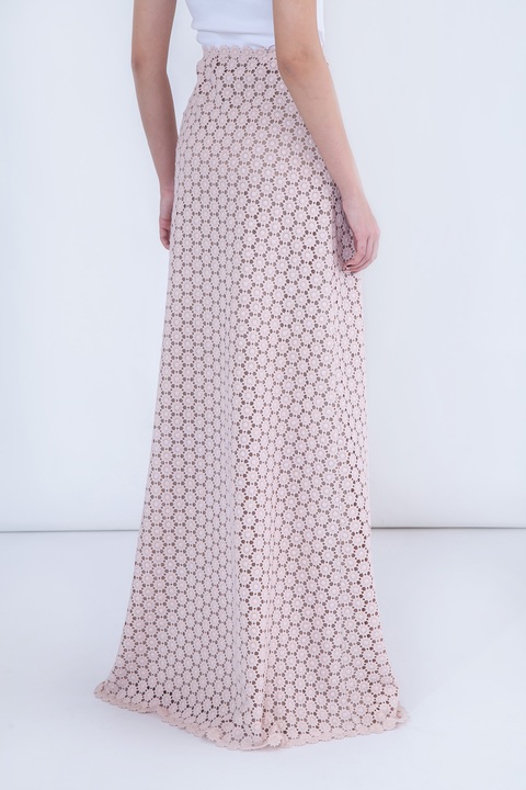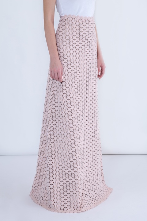 Изящная юбка-макси Alexander Terekhov А-силуэта. Модель выполнена из ажурного кружева с цветочным орнаментом пудрового цвета, ниспадающего мягкими складками. Изделие с завышенной посадкой на талии и фигурной кромкой. Застежка осуществляется на потайную молнию в боковом шве. Произведено в России.