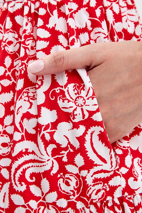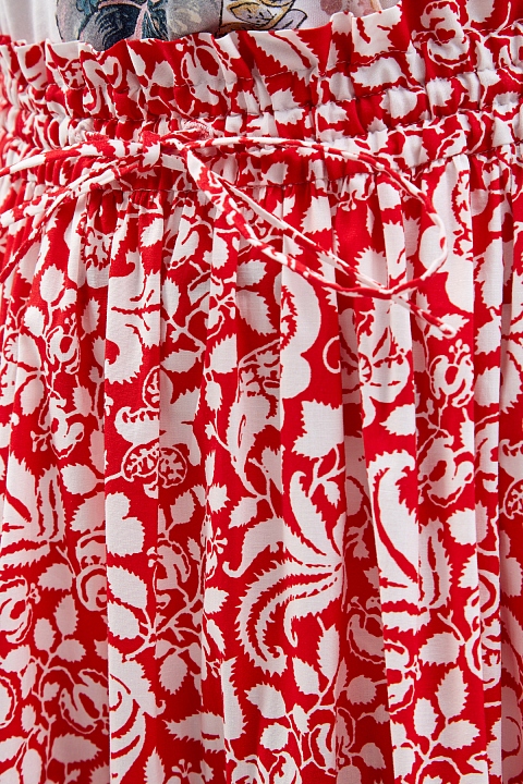Яркая юбка-миди свободного кроя от Alexander Terekhov выполнена из гладкого хлопкового поплина в красном цвете. Плотный, но легкий материал с натуральным составом обеспечивает максимальный комфорт в летний сезон. Белый паттерн с флористическим мотивом вносит расслабленный штрих в повседневный образ. Визуальный объем изделию придает многоярусный подол с заложенными складками. Детали: эластичный пояс на регулируемой кулиске, прорезные карманы по бокам.