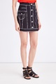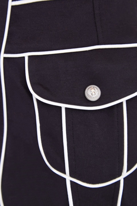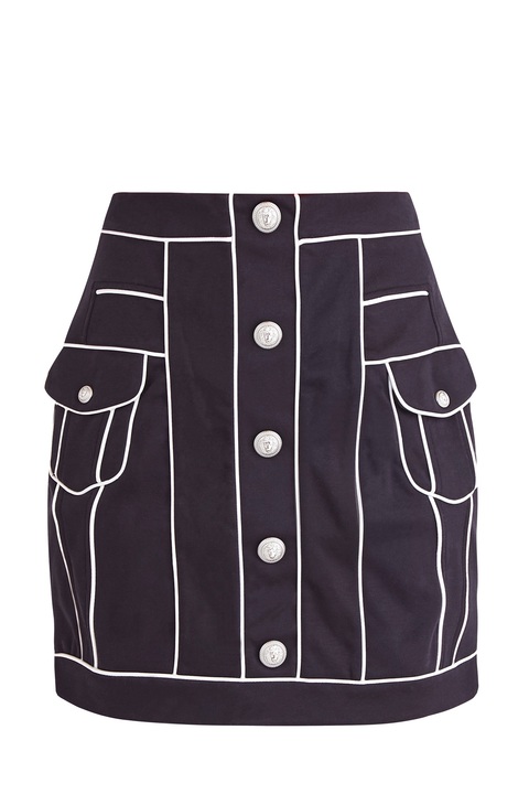 Юбка-тюльпан длины мини из новой коллекции Balmain с высокой посадкой на талии. Модель сочетает в себе классику, отражающуюся в натуральной хлопковой ткани черного цвета и крое, и фирменные детали бренда в виде крупных пуговиц с изображением льва, расположенных на центральной планке. Изделие характеризуется отделкой всех швов контрастной лентой, что задает динамики образу. Комфорт обеспечивает внутренняя подкладка и массивная застежка-молния в центральном шве спинки.