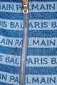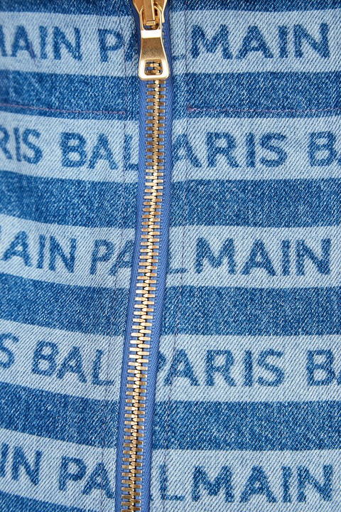 Эффектная юбка-карандаш от Balmain выполнена из плотного хлопкового денима — оригинальная фактура ткани придает классическому элементу гардероба нотку фирменного стиля глэм-рок. Модель на высокой посадке декорирована принтом в полоску с повторяющейся монограммой бренда. Массивная застежка-молния располагается по всей длине спинки изделия. Необработанные кромки и объемные швы завершают дизайн.