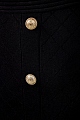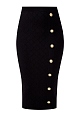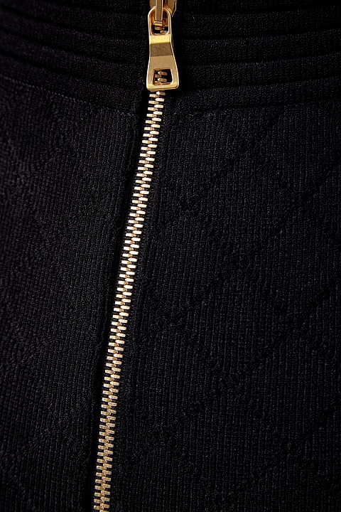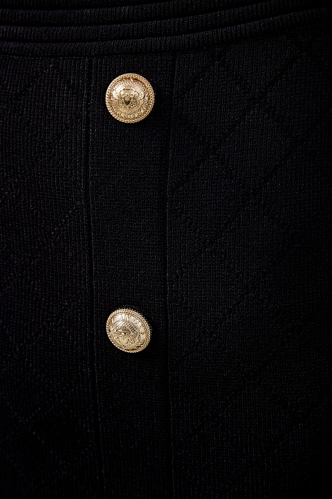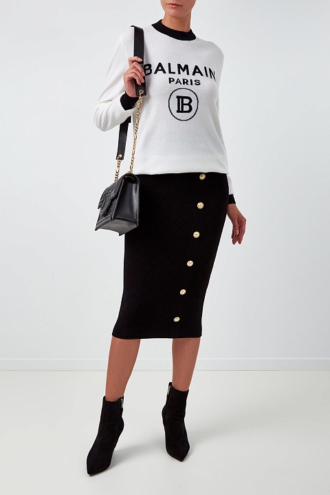 Черная бандажная юбка-карандаш от Balmain на завышенной талии выполнена из пряжи Stretch — эластичные нити обеспечивают максимально точную посадку по фигуре. Модель дополнена ромбическим узором с эффектом перфорации. Широкий пояс подчеркивает силуэт, прямой крой соответствует минималистичному дизайну, а фирменная золотистая фурнитура расставляет контрастные акценты в образе.