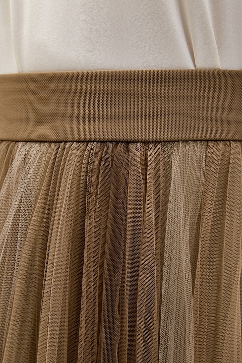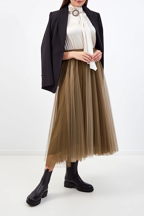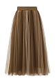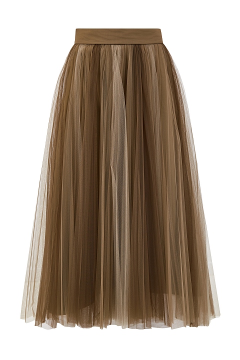 Пышная юбка-миди от Brunello Cucinelli представлена в оттенке капучино. Модель создана из объемной вуали, которая подчеркивает легкий и женственный характер изделия. Широкий пояс и подкладка из струящейся ткани с добавлением шелка обеспечивают комфортную посадку. Присборенный от линии талии крой формирует элегантный силуэт. Сделано в Италии.