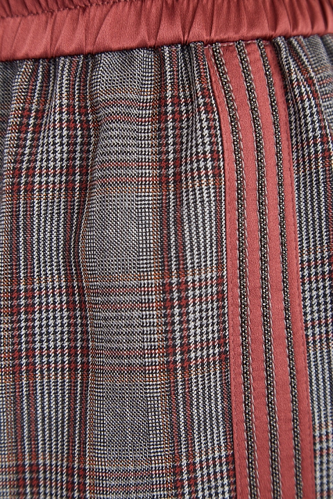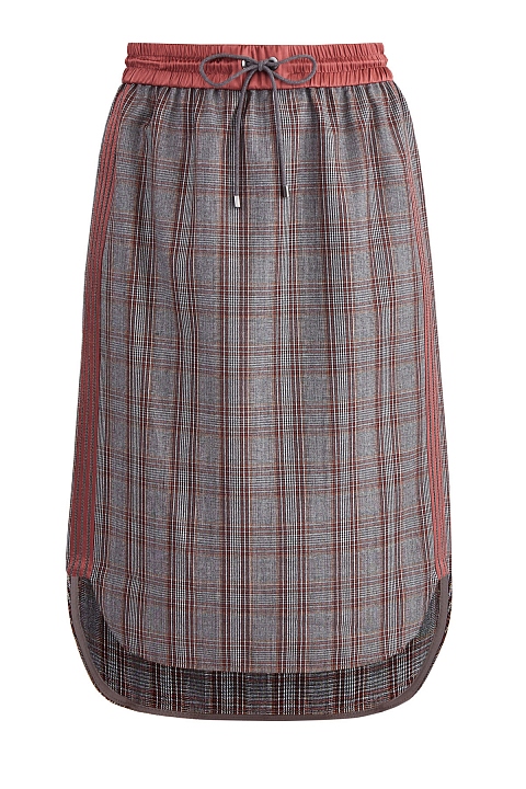 Лаконичная женская юбка из осенне-зимней коллекции Brunello Cucinelli создана из мягкой, легкой и в то же время теплой шерстяной ткани. Слегка неоднородная поверхность натурального материала подчеркивает принт в клетку «принц Уэльский», образованный переплетением нитей монохромной черно-белой гаммы, а также нитей табачных тонов и оттенков рябины. Образ в стиле спортшик создают асимметричные закругленные нижние кромки, а также выполненные из струящейся атласной ткани притачной эластичный пояс на кулиске и эффектные лампасы на боковых швах. Изысканная вышивка знаковым для модного дома элементом мониль придает образу фирменную утонченность. Сделано в Италии.